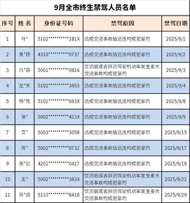 2025年9月全市终生禁驾人员名单。图源重庆市公安局交通管理局